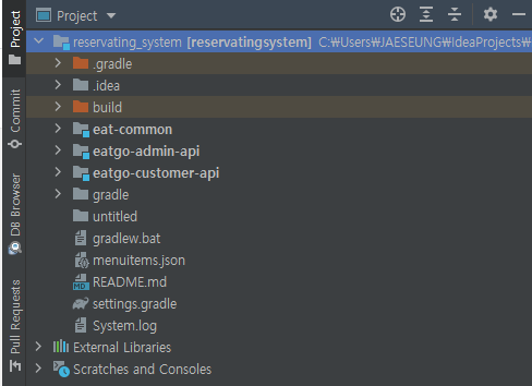ex) reservation_system 모듈폴더 아래 eat- ... 모듈 파일 생성(각 파일에는 Gradle. 파일이 있어야함)